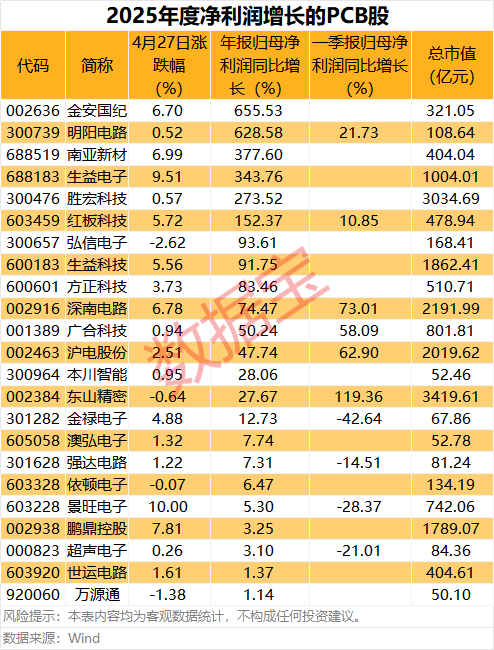 4月27日,A股PCB板块集体上涨,景旺电子、天津普林涨停,方邦股份、逸豪新材分别上涨16.28%、14.79%,其他还有生益电子、鹏鼎控股、南亚新材、深南电路等上涨超过6%。