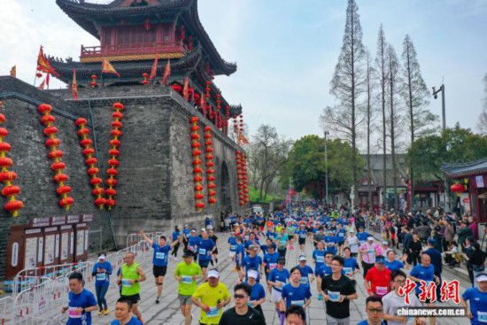 图为2026荆州马拉松选手跑过荆州古城宾阳楼。叶力铭 摄